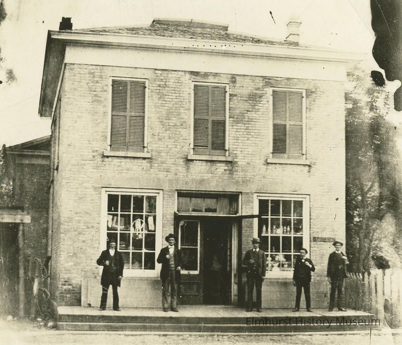 Image is identified on the back in writing as "The Graue Store, built 1864, 136 W. Park Ave. First brick building in Elmhurst. L to R William Asche, August Graue, William Graue, Richard Bourke, Tom Hogan." "Edith M. Morgan" has been written in ink on the back and crossed out.