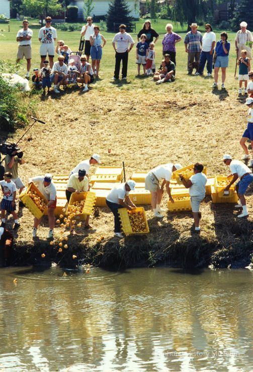 People emptying cartons of rubber ducklings into Salt Creek for the Great Elmhurst Duck Race. Scene is identified in ink on the back as "The Great American Duck Race / Eldridge Park / Salt Creek / c 1995." (Note: Race was sponsored by the Elmhurst Rotary Club.)Photograph Details