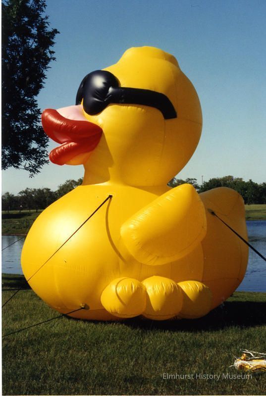 Large (10 foot) yellow duckling balloon. Caption, written in ink on the back, reads "The Great Elmhurst Duck Race / Eldridge Park/Salt Creek / 1993." (Note: The Elmhurst Rotary Club sponsored this charity event on July 11, 1993. Details can be found in the Elmhurst Press newspapers of June 30 and July 14, 1993. Photocopies are located in the Accession Drop File.)Photograph Details