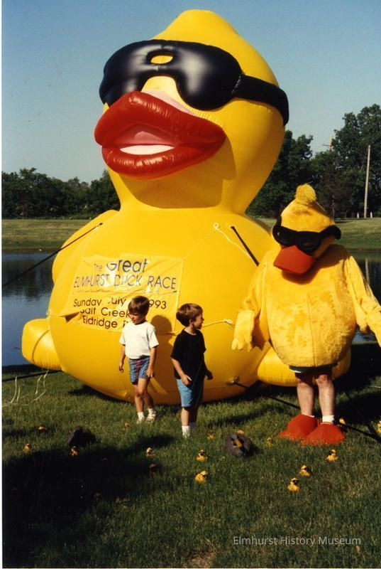 Yellow duckling balloon tethered beside a stream. Lettering on the chest reads "The Great ELMHURST DUCK RACE / SUNDAY July 1993 / Salt Creek Eldridge Park. "The Great American Duck Race / Eldridge Park/Salt Creek / 7/11/1993." (Photograph Details