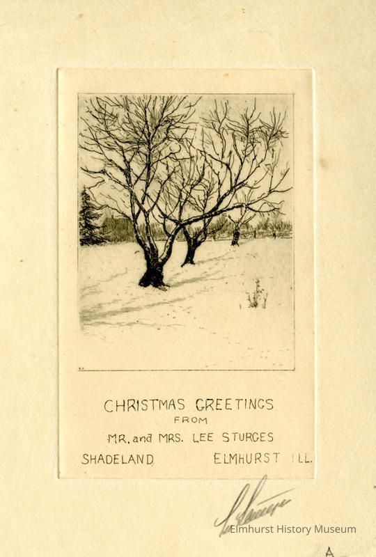 Rectangular card. Snow scene with trees. Printed on card are the words "CHRISTMAS GREETINGS FROM MR. and MRS. LEE STURGES SHADELAND ELMHURST, ILL." It is signed in pencil by Lee Sturgis. No date. Bottom lower right corner has an "A" in pencil.