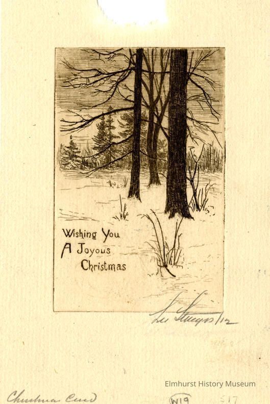 A Christmas card with the inscription: "Wishing You A Joyous Christmas" in lower right side of etching. Image features snow and trees. Signed and dated.