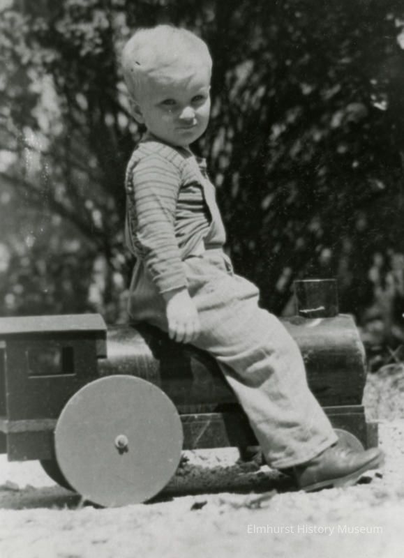 Toddler Greg Smith sitting on toy locomotive made from Craft Patterns.Photograph Details