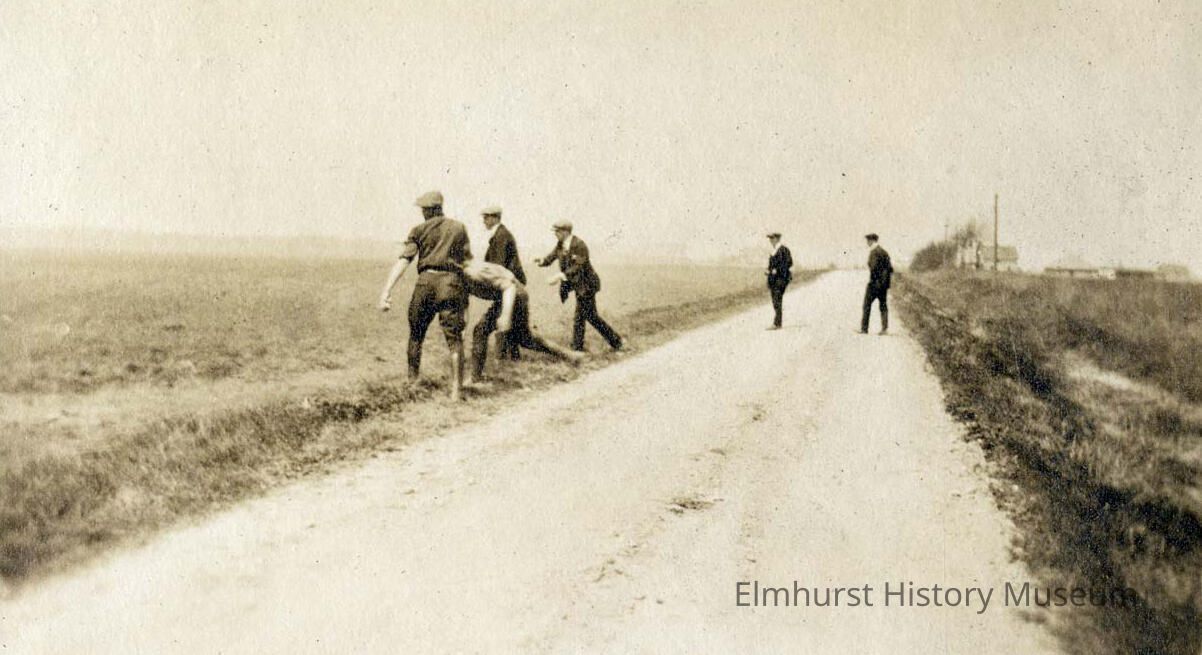 Six boys are shown throwing stones along an unpaved North Avenue.Photograph Details