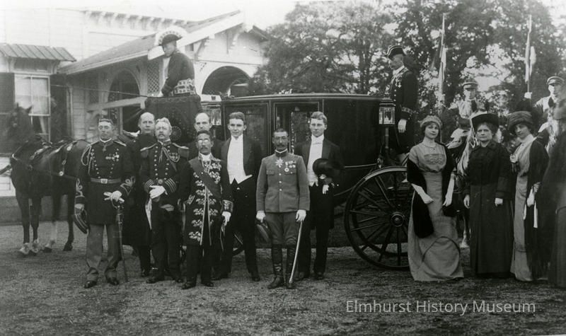A formal group shot of eight men wearing uniforms or tuxedos and four women. All stand outdoors, in front of a horse-drawn carriage with a driver. There is activity behind the group including more people, horses, and carriages. Charles Page Bryan is identified as second from left, and Jennie Bryan is identified as third from right.Photograph Details