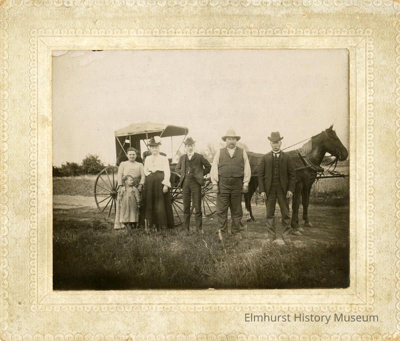 Group of two women, one child, and 3 men pose in front of a horse -drawn buggy. Man second from right is Gustav Fischer.Photograph Details