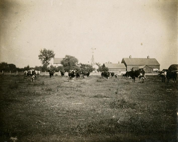 Livestock and farm buildings on the Gustav D. Fischer farm on Grand Avenue, 1/2 mile west of York Road.Photograph Details