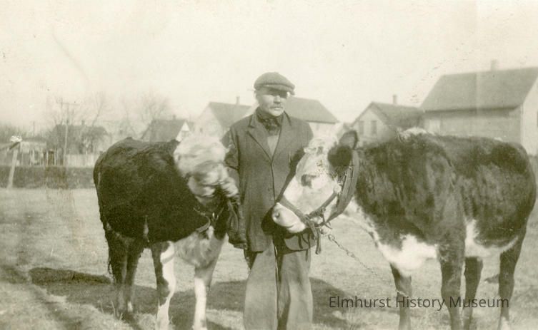 Gustav Hintz standing in a grassy area with two cows, houses in the background.Photograph Details