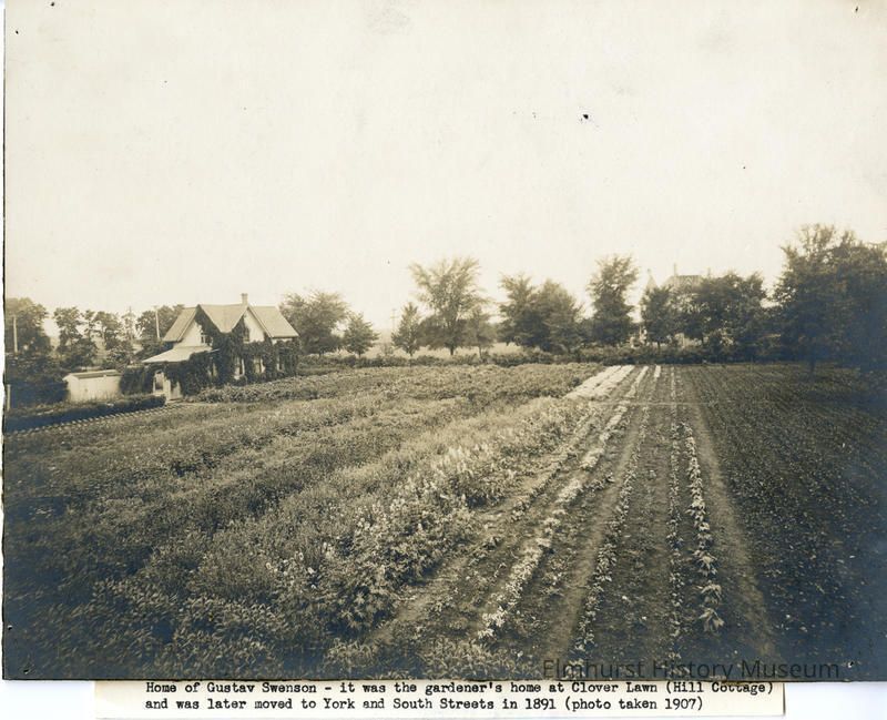 Caption on front: Home of Gustav Swenson. NE corner York & South St. Home was formerly the gardener's home at Clover Lawn - York St. north of St. Charles Rd. Moved to S. York St. by John R. Case about 1891. / This picture taken July 10, 1907. Stamped on back: Elmhurst Public Library / Elmhurst, ILL, 60126 On back: Presented through Martha Ibbetson Chapter D.A.R. Elmhurst, Illinois