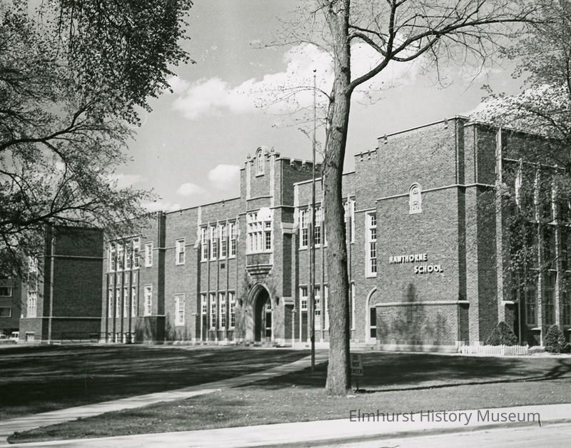 Written on back: Hawthorne School-Cottage Hill Ave and Arthur St. / Taken May 18, 1966 by R.L. Mahon with Kodak Retinette (45mm. lens) Roll 1 Frame 15A / EK Plus X Pan Film / 1. Original School built in 1888 / 2. Building burned 1917 / 3. 2nd Hawthorne completed in 1920 - Perkins & Will and 2nd story added-E. Norman Brydges-Built-1932.