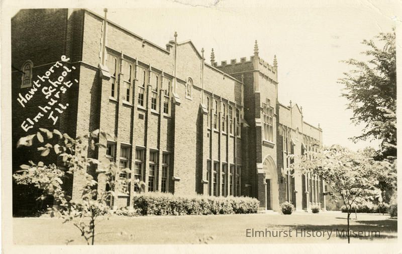 "Hawthorne School, Elmhurst, Ill." is written in white on the front. Image shows the west façade of the building.Photograph Details