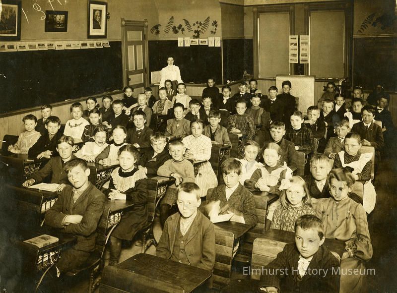 Sepia-toned photograph mounted on cardboard, students in a classroom at Hawthorne School on Cottage Hill Avenue and Arthur StreetPhotograph Details