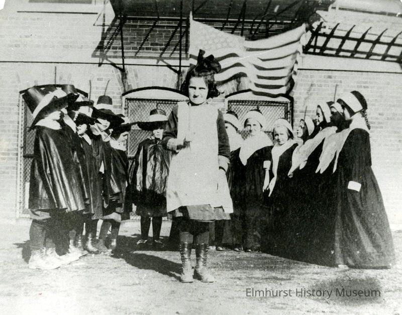 on back: 3rd grade- Hawthorne Thanksgiving Program Bernice McNichols carrying the flag c. 1913 (Mrs. Carl Balgemann)