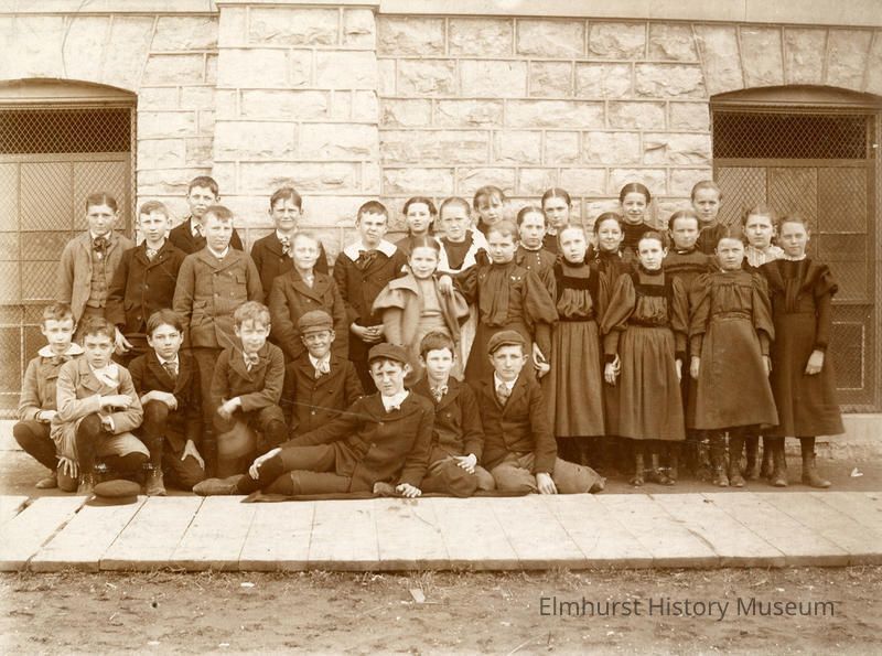 on back: 4th grade Hawthorne School, Elmhurst 1894? Names of students written in bottom margin on front: Nelda Heegard, Clara Glos, others illegible.