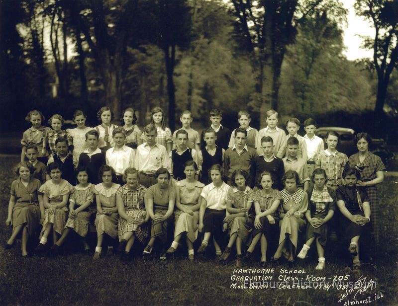 In the lower right corner of the image there is white print that reads "Hawthorne School Graduation Class-Room-205 Miss Smith - teacher 1934'35 Delmar Studios Elmhurst, iLL"
