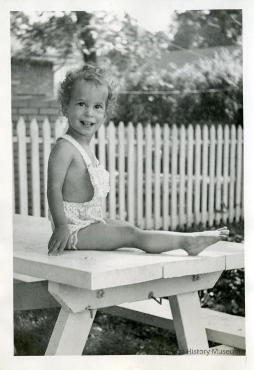 Helen Reiff sits on a picnic table in backyard of 628 Fairview Avenue homePhotograph Details