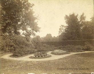 On back: No. 6 No 90-K / Formal garden at Clover Lawn - Cottage Hill & St. Chas. (Hill Cottage before it was moved to York St.) / Elmhurst Public Library - Elmhurst, Ill. 60126 / Presented by Swenson Estate through Martha Ibbetson Chapter - D.A.R. Elmhurst, Illinois