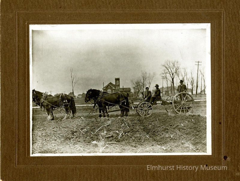 Horse-drawn wagon in a field looking north. Faith United Methodist Church, on northwest corner of North Avenue and York Street, is in the background.Photograph Details