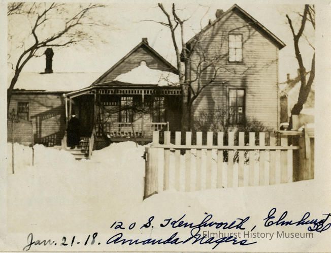 On front: 120 S. Kenilworth / Elmhurst, Ill. / Jan. 21-1918 / Amanda Magers Caption taped on back: House west of present clinic. Razed when clinic was built in 1950. House set back on Kenilworth but faced York St. Small section 1st part of building. Tall addition added in 1906. Gift of Amanda M. Niemeyer Stamped on back: Elmhurst / Historical / Commission