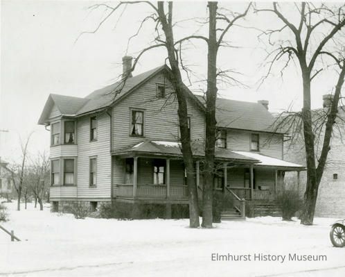 On back: Home of John Hahn - 144 N. York St. - built in 1860's - 2 additions in later years (Leonard's store there in 1960's and 1970's...) Photo shows York theatre bldg. to the north - Mr. Hahn was the father of Johanna Hahn Keiler who lived there until bldg. was demolished in 1929. Her son Albert and his wife Emma (married 1920) lived there also and later moved to Larch Avenue. Stamped: Elmhurst Historical Commission