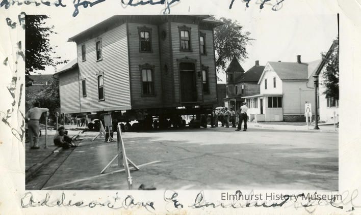 On front edges: Addison Ave Elmhurst Ill / Moved for Aug 1948 On the back: This is the / way they / move them / in Elmhurst / Cousin / Earl Sticker on the back: Mr. & Mrs. E. Rhodes / 125 W. North Ave. / Lombard IL 60148