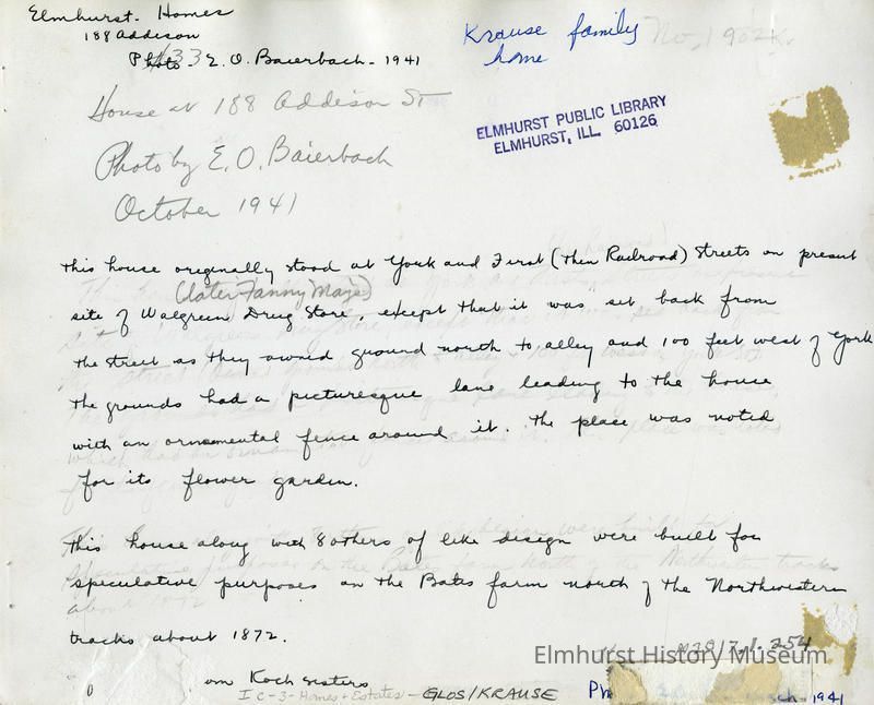 The house at 188 Addison Avenue, also known as the Krause house. It originally stood at 101 N. York and was later moved to 188 Addison Avenue.Photograph Details