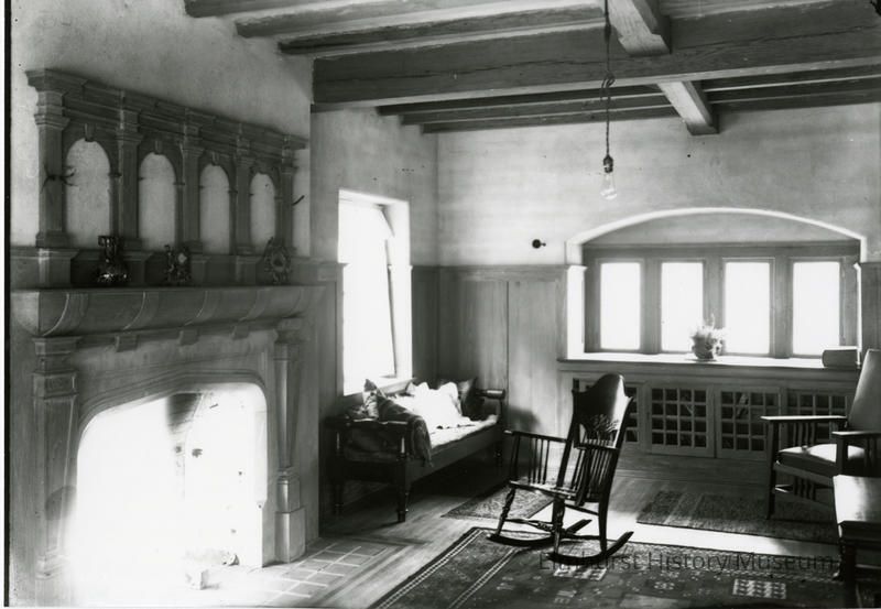 A black and white photograph of a living room space in the house at 208 Arlington, also known as the Miller/Porter Home. To the left in the photo is a fireplace, and in the center of the room is a rocking chair. The general aesthetic of the room is late 19th century Arts & Crafts.