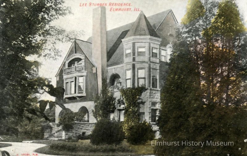Stamped on back: Elmhurst / Historical / Commission Lower left corner on front: M. Kross, Pub Top center of front: Lee Sturges Residence / Elmhurst, ILL