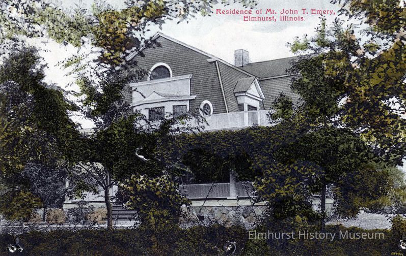 "Michael Kross" is signed on back in ink. "Elmhurst Historical Commission" is stamped in black on the back twice. Printed on the back left side is production information "M. Kross, Publisher, Elmhurst, Illinois, No. 5 Made in Germany. "Residence of Mr. John T. Emery, Elmhurst, Illinois" is printed in red above the house.