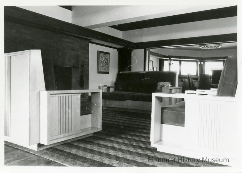 Black and white photograph, interior view of 301 S. Kenilworth, also known as the F.B. Henderson House, designed by Frank Lloyd Wright and H. Webster Tomlinson Design.Photograph Details
