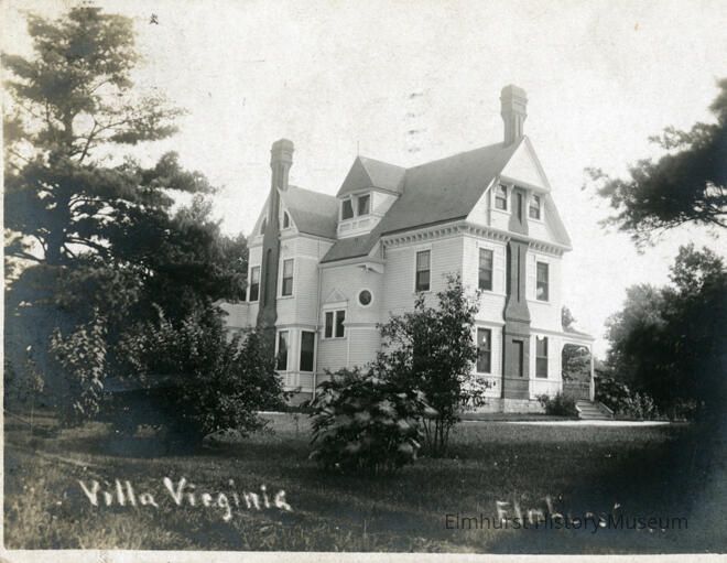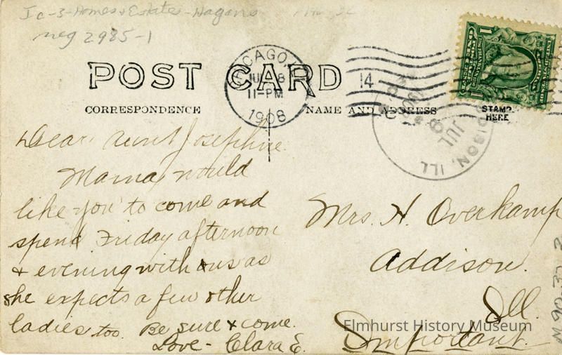 Message to "Aunt Josephine Overkamp" from "Clara E" on the back. Dear Aunt Josephine/Mama would/like you to come and/spend Friday afternoon/ & evening with us as/she expects a few other/ladies too. Be sure & come/Love Clara E. White caption under the image: Villa Virginia / Elmhurst