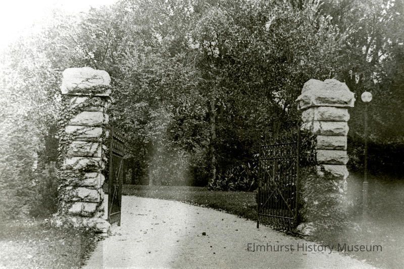 Hand-written on the back: Entrance to "Cloverlawn," home of Frank Sturges Family - York Street entrance, approx date - 1910 - 1915 Elmhurst Historical Commission is stamped on the back