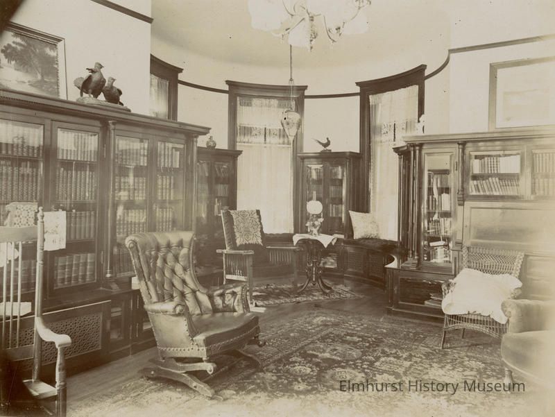 View of the library in the Frank and Jannette "Lillie" Sturges home at 333 Cottage Hill Avenue, known as Clover Lawn.Photograph Details
