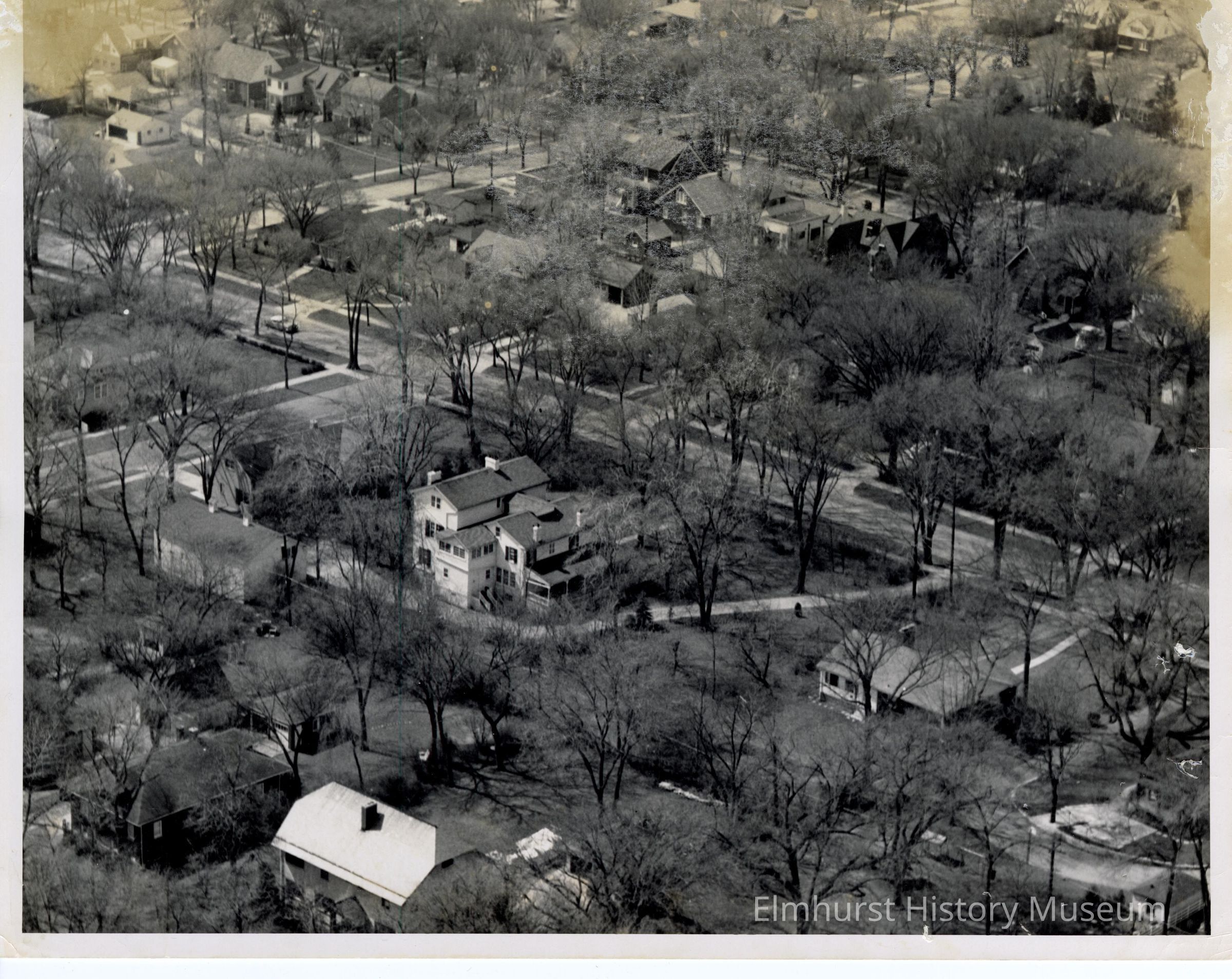 Aerial view of Hill Cottage house at 413 S. York Street, looking southwest.