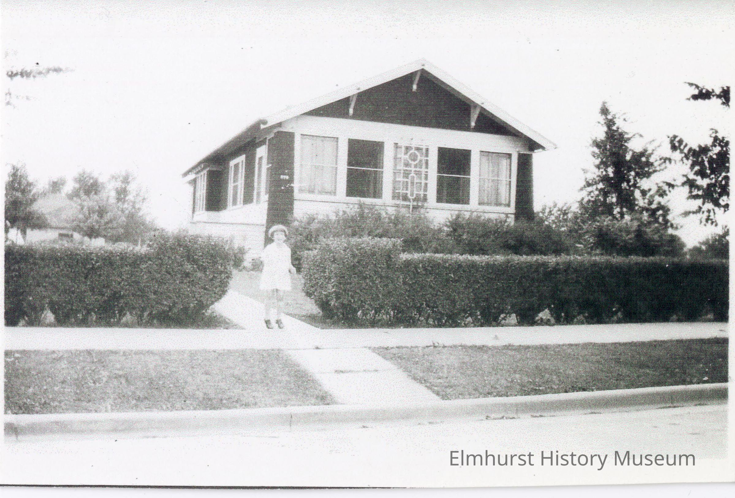 View of the house at 570 S. Sunnyside Avenue, looking west. Mary Lou Hildebrand, age 2, is at the sidewalk.Photograph Details