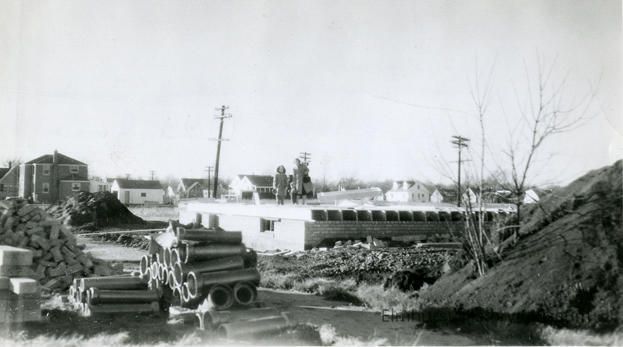Joan, Carol, and Lorraine Kenn standing on top of the basement of house under construction at 732 S. York Street.Photograph Details