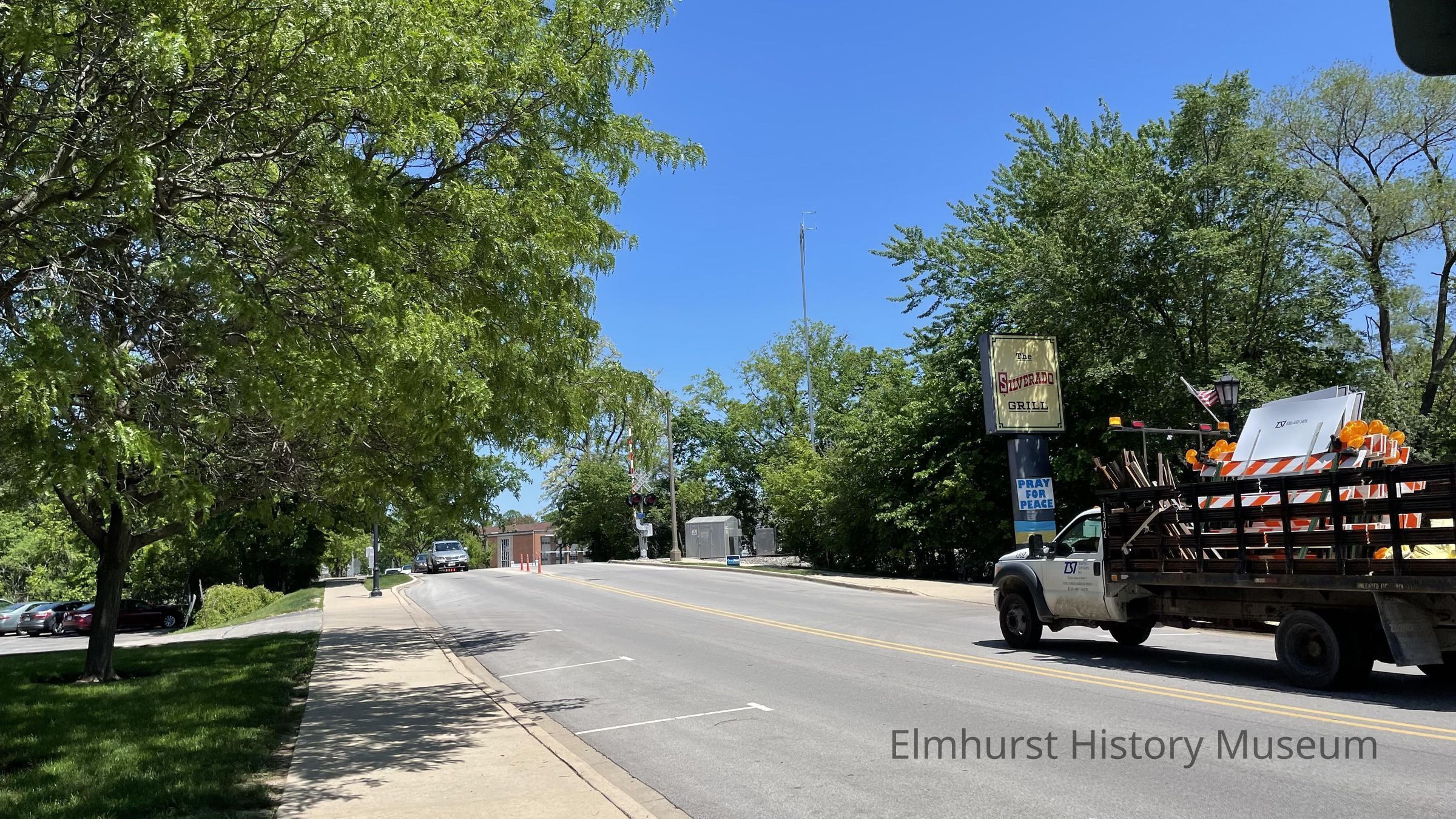 Illinois Central railroad crossing at Spring Road, looking north toward the tracks. Silverado Grill is at right.Photograph Details