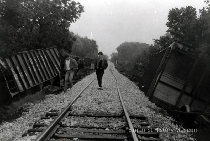 Men walking on tracks after the Illinois Central Railroad train wreck just east of York Street.Photograph Details