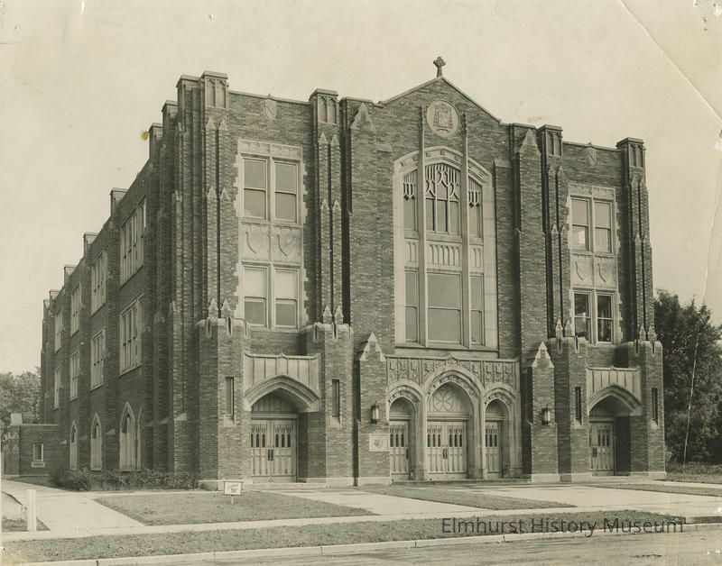 Writing on the back reads "Immaculate Conception Church (used as grammar school) Arthur St. / Built in 1929. Church was on ground floor with classrooms on 2nd Floor. / Third floor was finished in 1936 for high school. / 1957-8 - 7 additional classrooms added to rear." Also noted on back are slide and negative numbers.