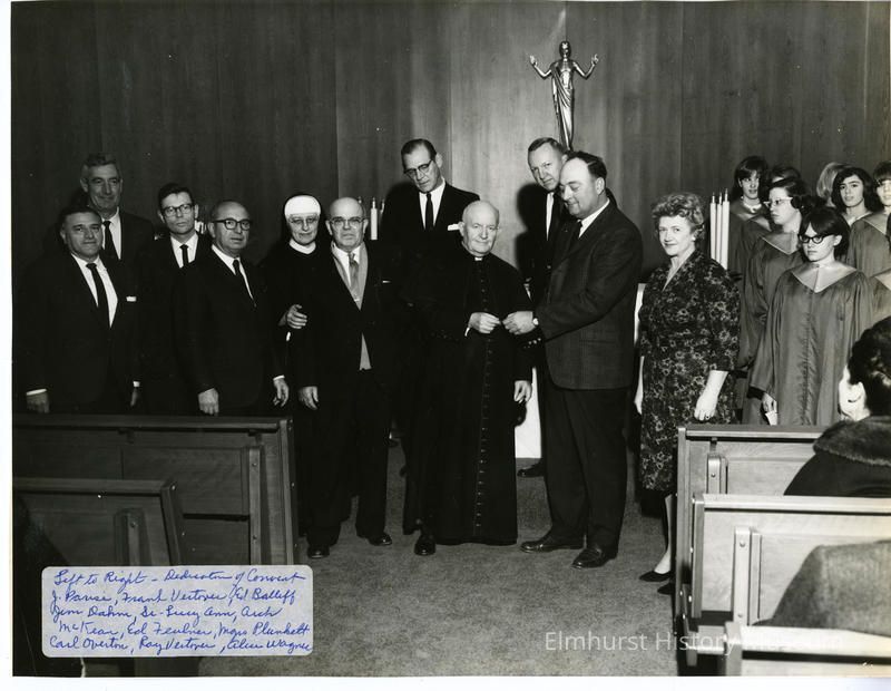 Handwritten on white label in the lower left corner: Left to Right - Dedication of Convent / J. Parise, Frank Vertovec, Ed Balliff / Jim Dahm, Sr. Lucy Ann, Arch / McKean, Ed Feulner, Mon. Plunkett / Carl Overton, Ray Vertovec, Alice Wagner Penciled in top right corner of back: 2186
