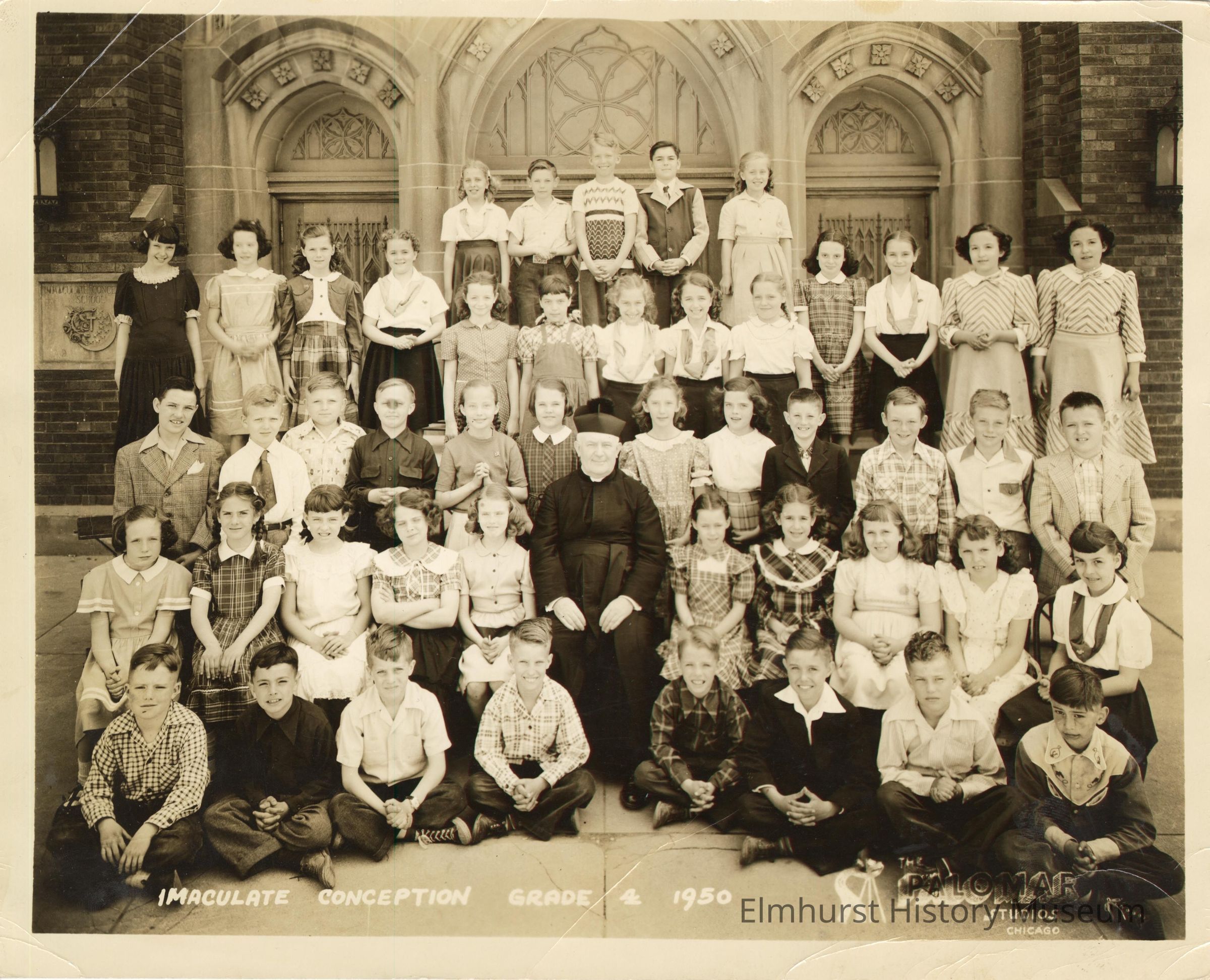 Immaculate Conception Grade School fourth grade class portrait. Monsignor William J. Plunkett is center.Photograph Details