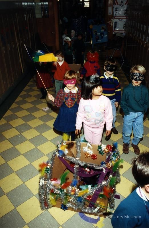 Children in costume march through the halls of IC Grade School at 132 Arthur St for a Mardi Gras Parade.Photograph Details
