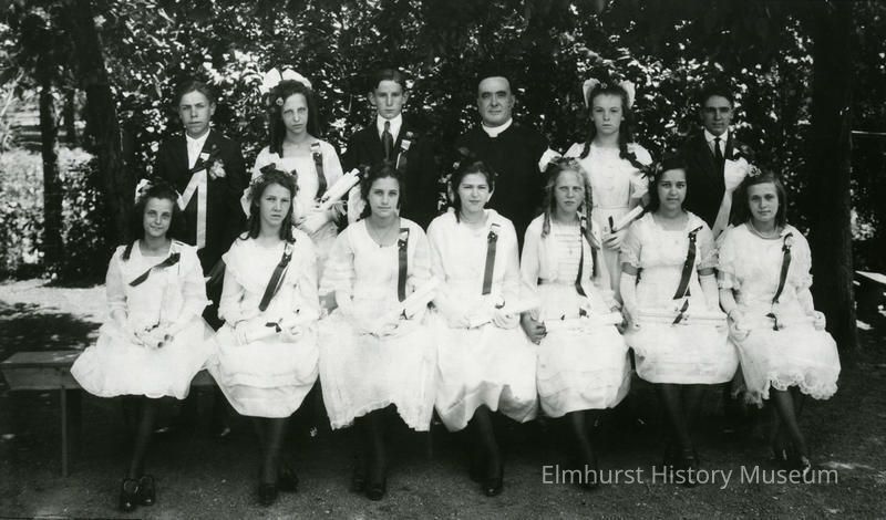 On back: Immaculate Conception School June, 1921 Top Row: Harold Ollier, Orvilin Strays, Paul Ronske, Rev. Hennessey, Clara Rozek, Lawrence Ryan Bottom Row: Margaret Van Huisseling, Eleanor Shannon, Eileen Wozny, Agnes Surges, Barbara Weiler, Gervaice Kappus, Anna Kentgen