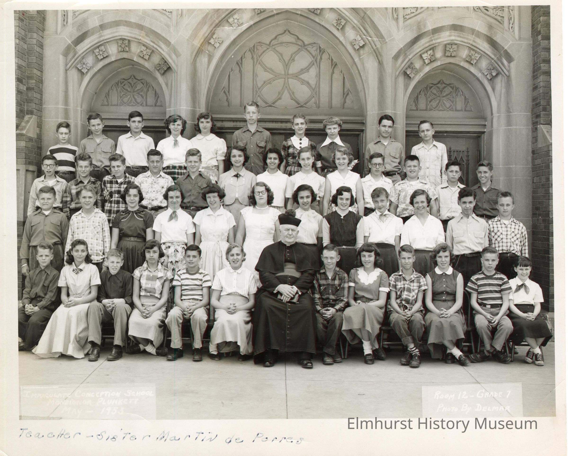 Immaculate Conception Grade School seventh grade class portrait. Monsignor William J. Plunkett is center.Photograph Details