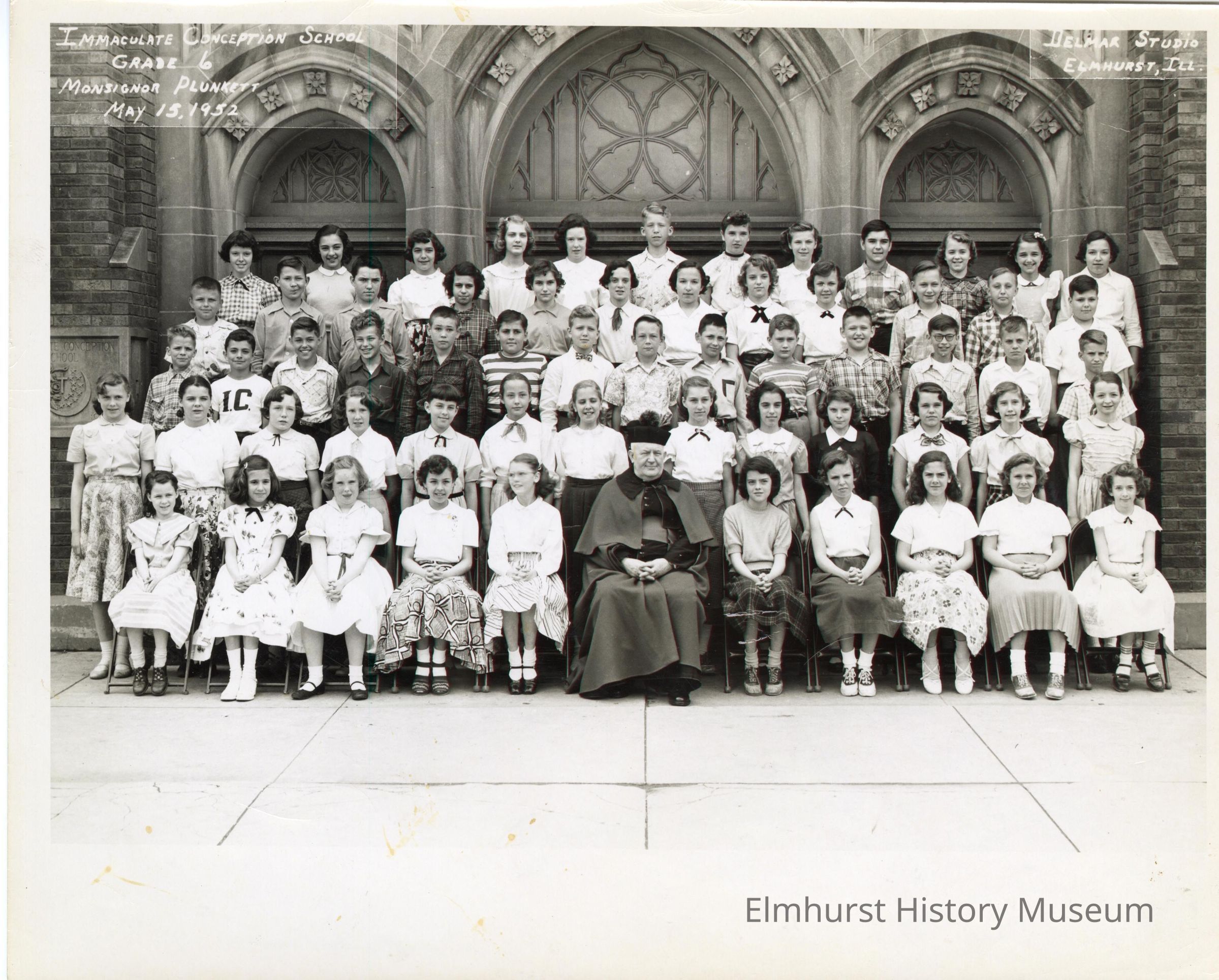 Immaculate Conception Grade School sixth grade class portrait. Monsignor William J. Plunkett is center.Photograph Details