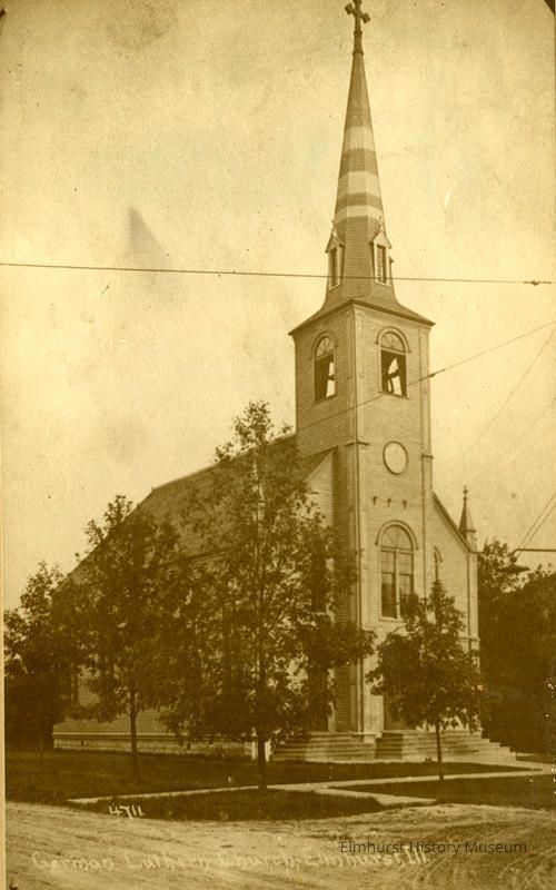 Immanuel Lutheran Church at the southeast corner of Third Street and Michigan Street. Caption reads: 'German Lutheran Church, Elmhurst, Ill.'Photograph Details