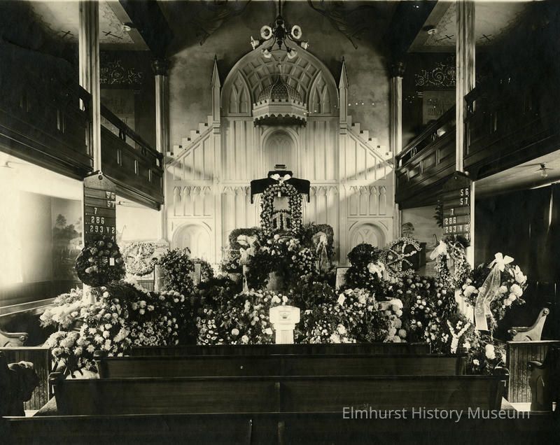 View of Immanuel Lutheran Church interior decorated with flowers for a funeral. The church is at 142 E. Third Street.Photograph Details
