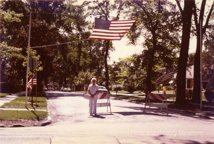 A flag display on Claremont Street during the 1976 Bicentennial Independence Day paradePhotograph Details