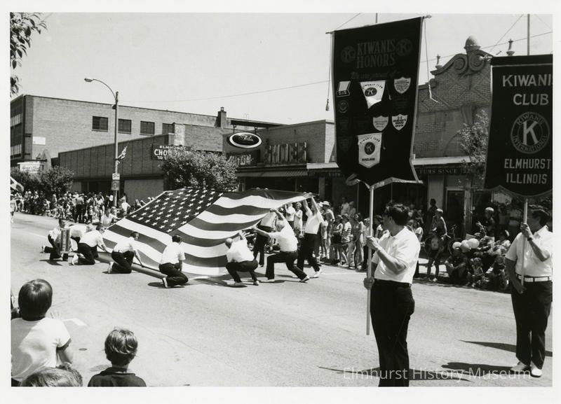 Members of the Kiwanis Club displaying the American flag in the Elmhurst Fourth of July parade on N. York Street.Photograph Details