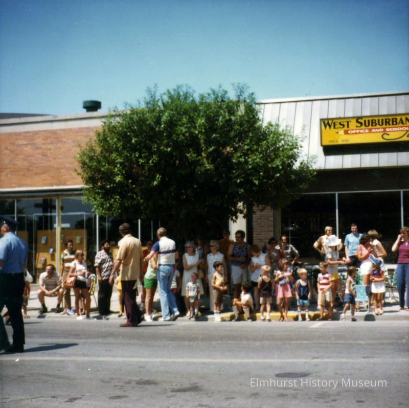 Marchers in the Independence Day parade on N. York Street. Governor Jim Thompson is pictured in the striped shirt.Photograph Details